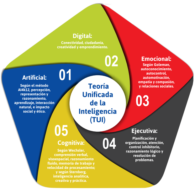 El Instituto IA-5 implementa un currículo fundamentado en la Teoría Unificada de la Inteligencia (TUI), que integra las cinco inteligencias con 27 indicadores: